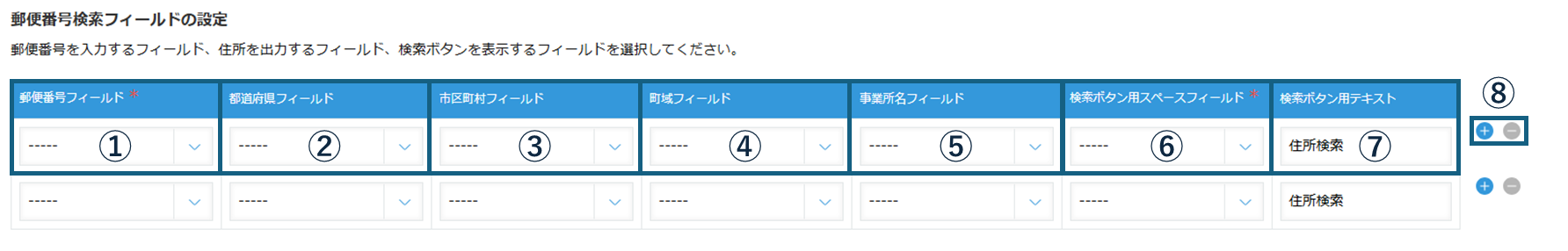 郵便番号検索を行うボタンを表示するスペースフィールドを選択します。 要素IDが存在するスペースフィールドを設定可能です。 ※ 検索ボタン用スペースフィールドは必ず設定する必要があります。 ※ 設定したスペースフィールドは、他の設定行では使用できません。
