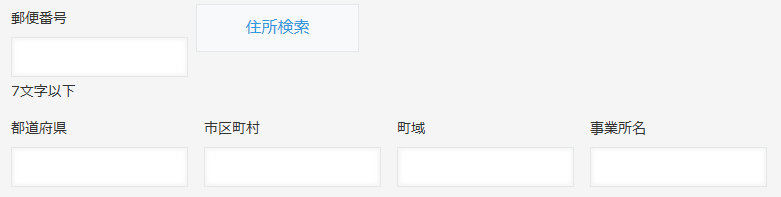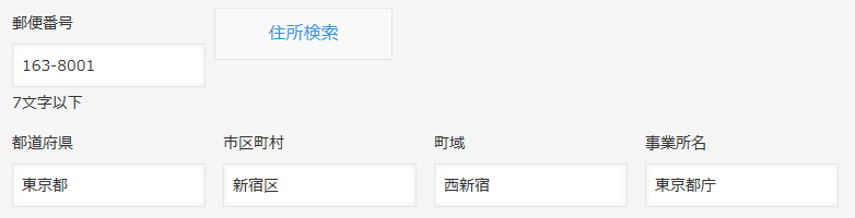 本機能は日本郵便の郵便番号・デジタルアドレスAPIを使用しています。郵便番号・デジタルアドレスAPIのメンテナンスや障害時、または住所検索の利用が集中した場合、一時的に検索できないことがあります。 その場合は時間をおいて、再度お試しください。