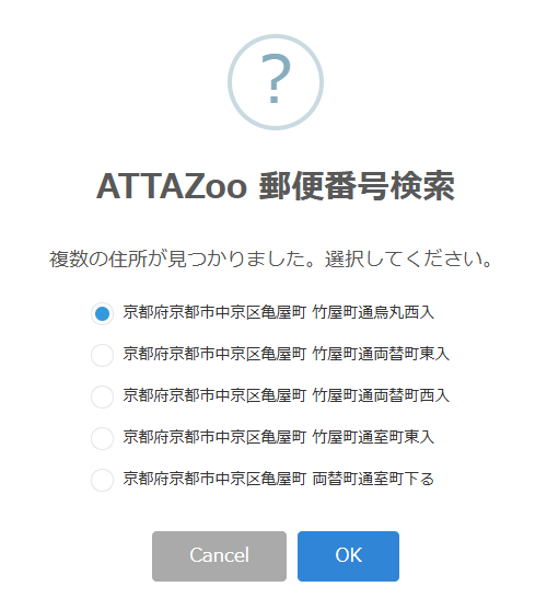1つの郵便番号に複数の住所が登録されている場合、選択ダイアログが表示されます。 一覧から住所を選択し「OK」ボタンを押すと、選択した住所がフィールドに入力されます。